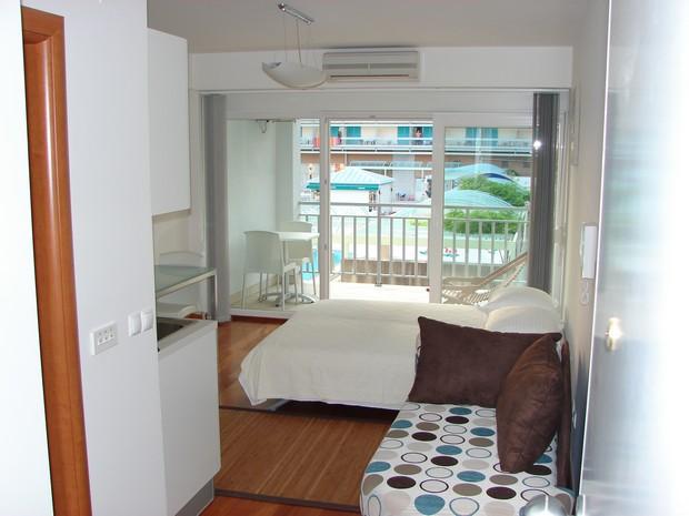 Апартаменты расположены на третьем этаже и состоят и комнаты-студио, с двуспальной кроватью и раскладным диваном, кухонного уголка, стола со стульями в студио и стола со стульями на большой лоджии, ЖК TV, бесплатный Wi-Fi, ванной комнаты с душевой кабиной.