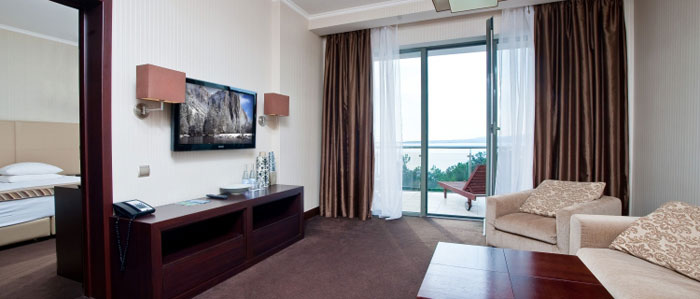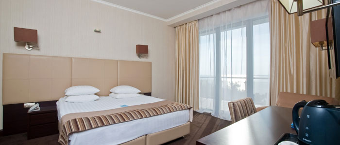 Двухкомнатный номер 53 кв.м. на Клубном этаже с небольшой уютной гостиной. Спальня с трансформируемой кроватью (большой французской кроватью или двумя раздельными кроватями). В каждом номере: автономная система кондиционирования, ванная комната с набором полотенец, фирменной косметикой и феном; телефон, спутниковое телевидение, мини-бар (комплектуется за дополнительную плату), мини-сейф, балкон.