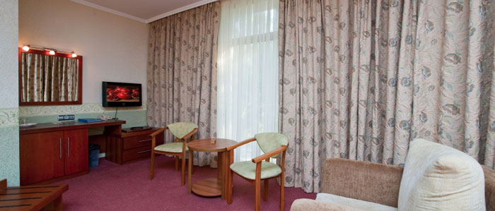 Большой однокомнатный номер площадью 30 кв.м с французской кроватью, часть номера отведена под гостиную с мягкой мебелью, автономная система кондиционирования, телевизор, телефон, мини-бар, мини-сейф, санузел - ванная или душевая кабина, балкон.